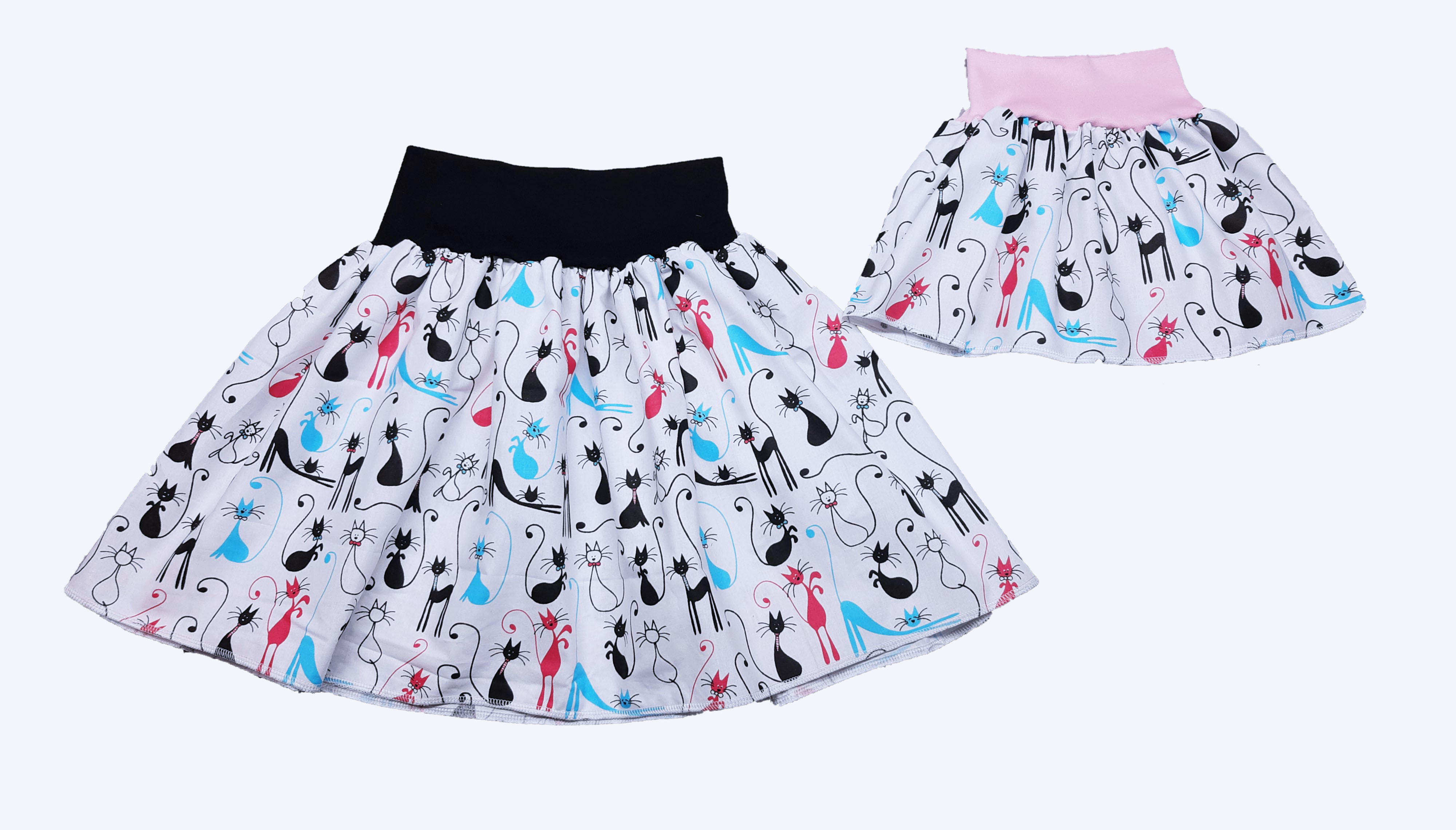 Feeling, SET dámská sukně + dětská, bílá s barevnými kočičkami, dámská pas černý, dětská pas sv. růžoví