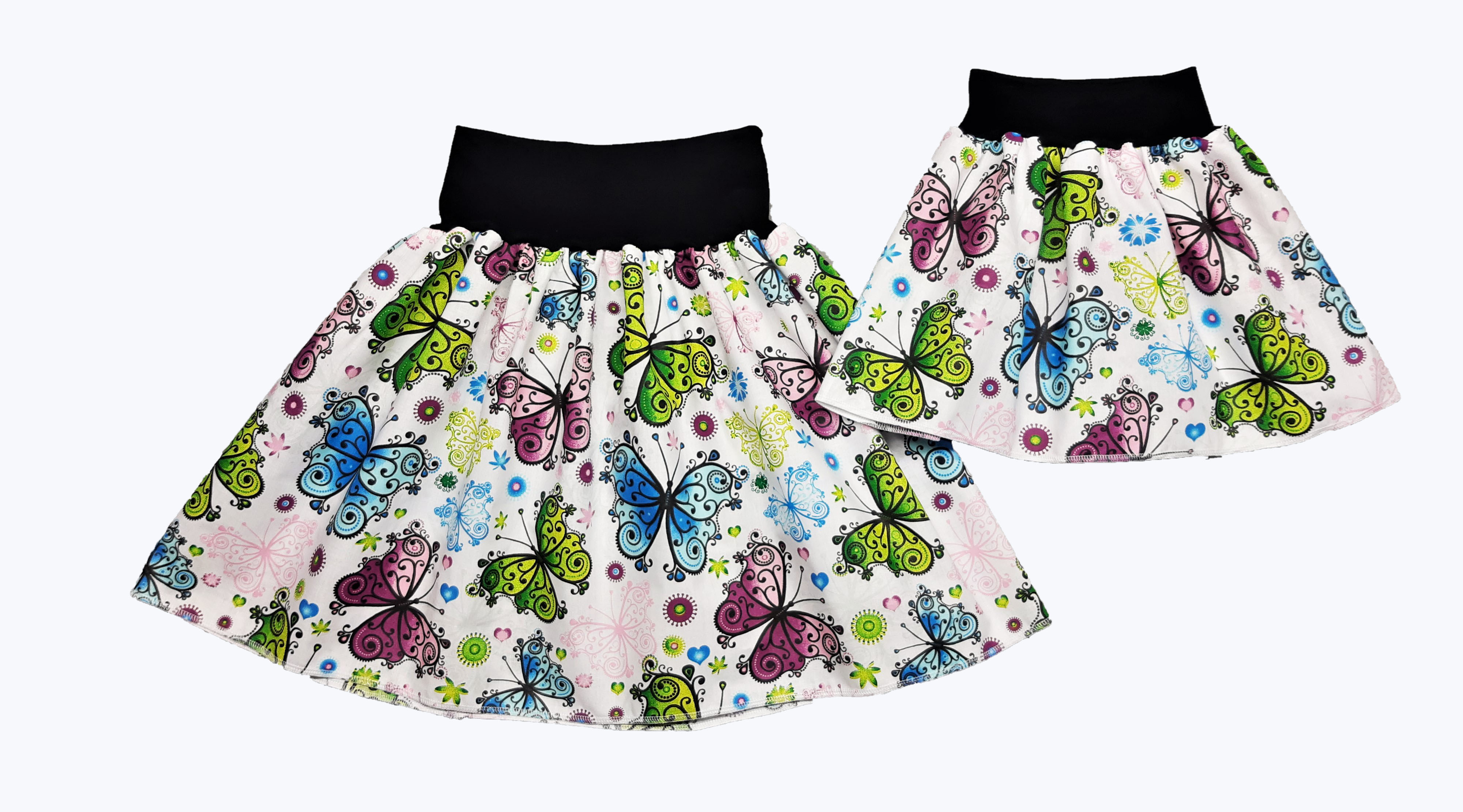 Feeling, SET dámská sukně + dětská, bílá s barevnými motýli , pas černý