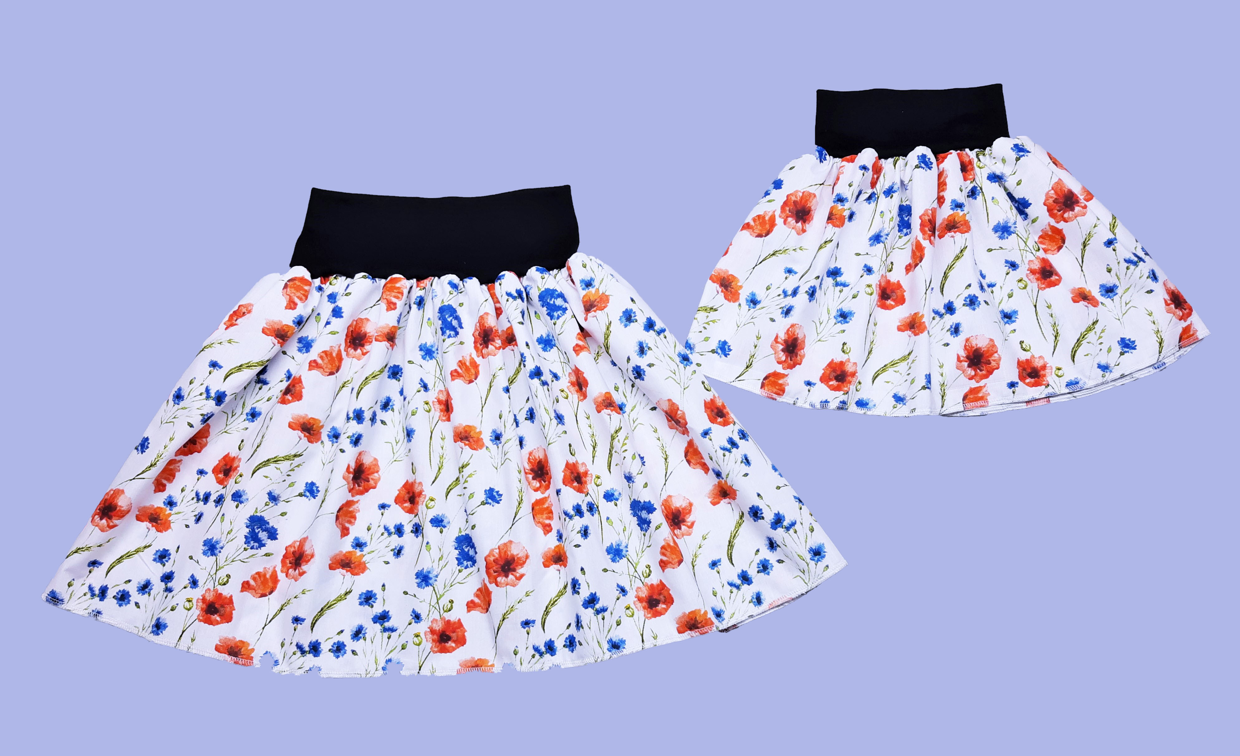 3. Feeling, SET dámská sukně + dětská, bílá s květy vlčích máku, pas černý