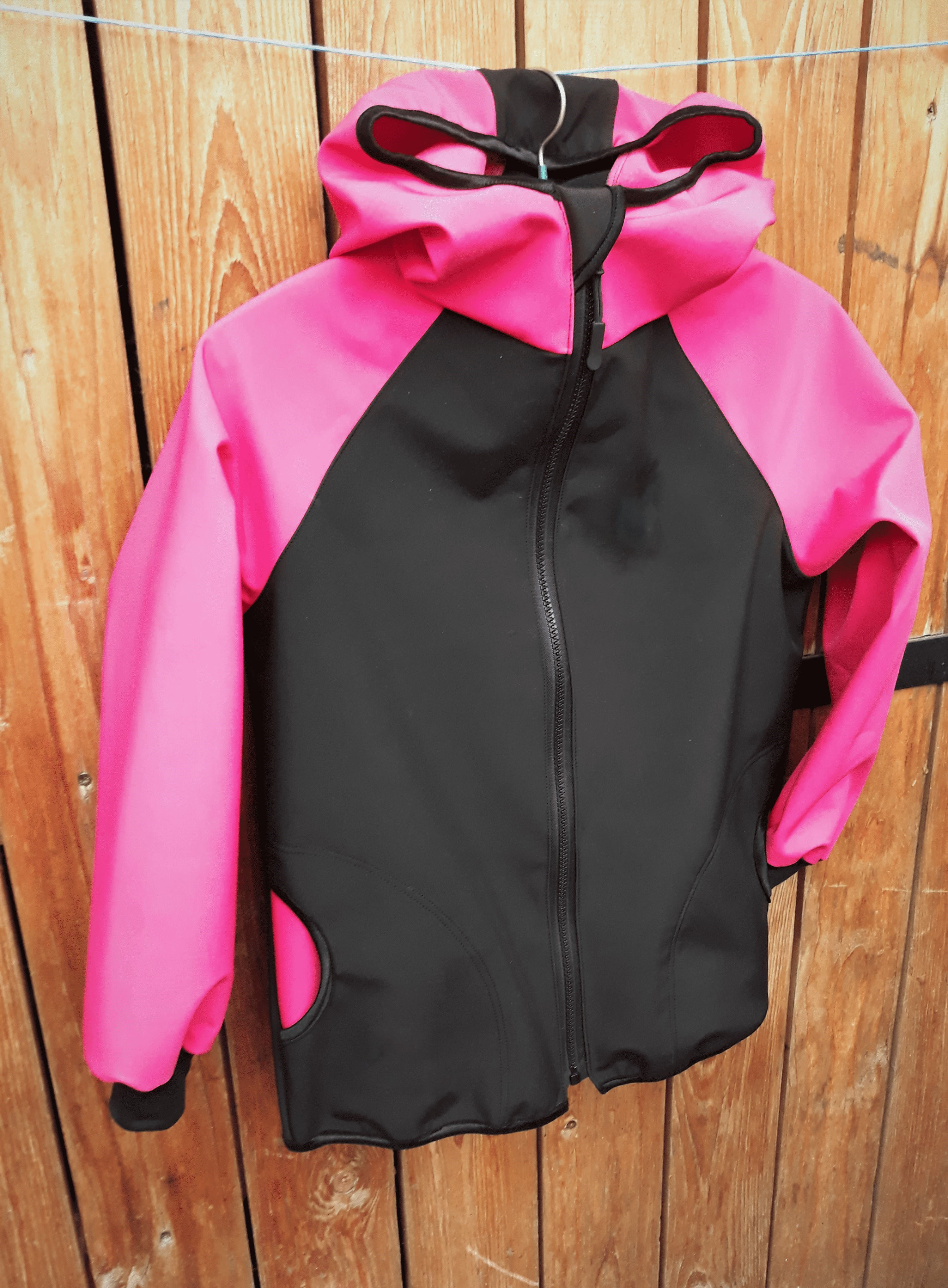 Feeling, softshellová bunda jaro/podzim z rubu úplet, s kapucí, černo růžová
