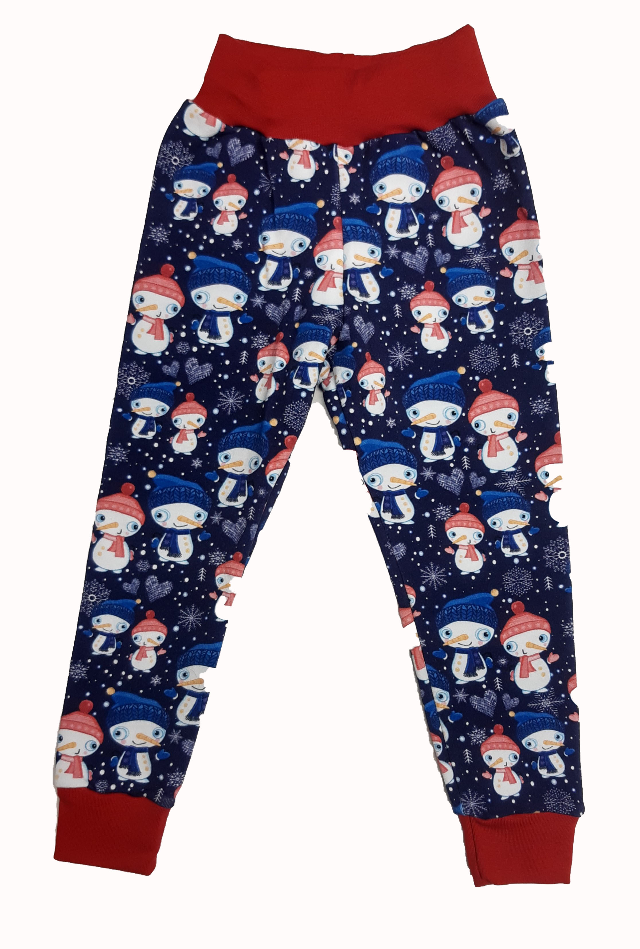 3. Tepláky dětské, vel. 116, se sněhuláky a červený lem