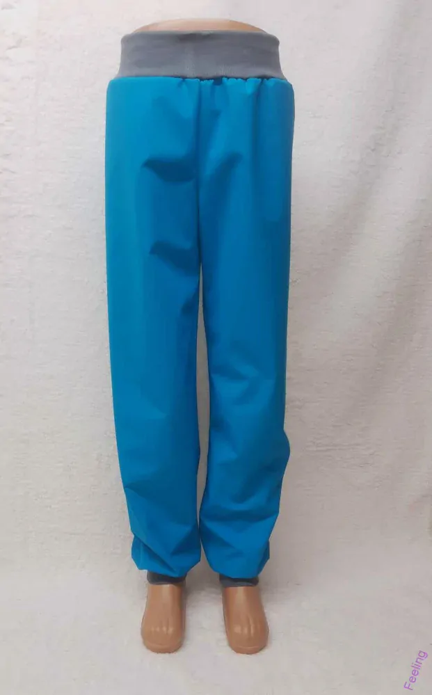 Dětské softshellové kalhoty, v pase a na nohavicích mají pružný lem.