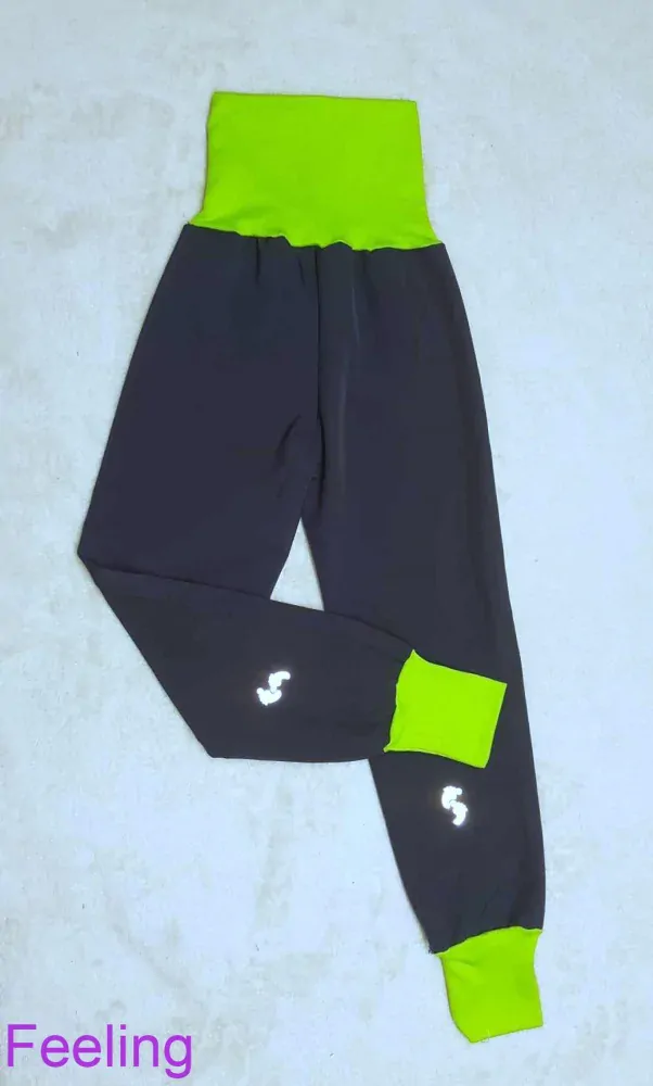 - Softshellové kalhoty s fleece vrstvou rostoucí, vel.110/116 šedé s limetkou a reflexními prvky